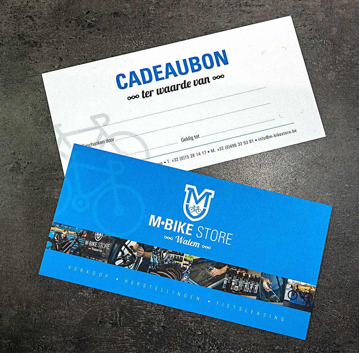 Met een M-Bike Store cadeaubon kiest de ontvanger zelf uit ons ruime aanbod fietsen, accessoires of onderhoud. Verkrijgbaar in de winkel en te betalen met bankkaart, cash of eco-cheques. Kom langs en verras iemand met een geschenk dat blijft rollen!